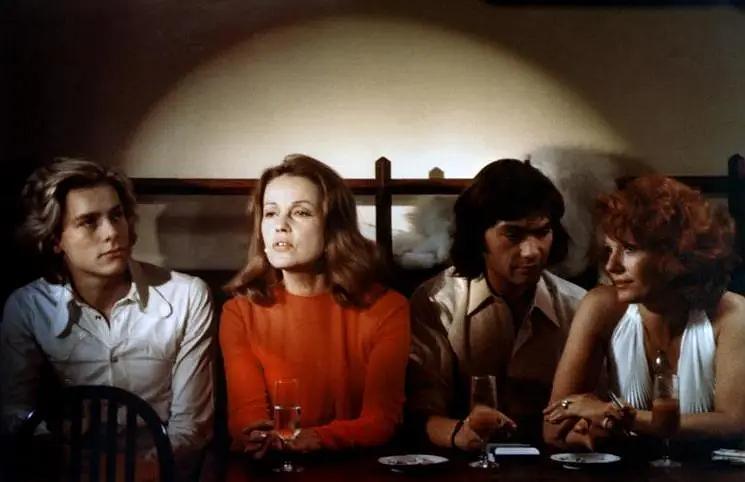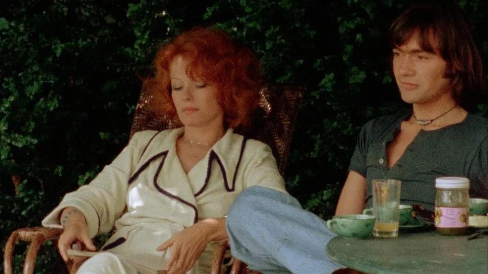 “整个自然生命的进程,皆是一种氧化过程。”(La vie de la nature tout entière est un processus d’oxydation)这句出自“蓝花诗人”诺瓦利斯(Novalis)的断言,仿佛也可以归于盖·吉勒斯名下。《倾斜的花园》((1975)宛若一座温室,观众得以从中目睹小说幻境中那些结晶、蒸发、燃烧与微妙变异的发生。在这个被植物覆盖、对每一丝变幻(露水、微风、雷雨)都敏感颤动的布景中,几位银幕上的“美丽植株”——德菲因·塞里格、萨米·弗雷(Sami Frey)、帕特里克·让内(Patrick Jouané)、菲利普·谢蒙(Philippe Chemin)、让娜·莫罗——试图适应“生活”及其不断流逝的时间。但时间,即便在电影中,也无法真正暂停。影像若能显现其光辉,那正是因为银盐正在被氧化、逐渐变黑。于是塞里格的发丝泛出铁锈的光泽,莫罗的嗓音沙哑失色,弗雷的身体僵硬得仿佛金属,少男们的面孔也染上了紫色的阴影。因为梦想一旦接触到爱情或金钱,就迅速开始氧化。