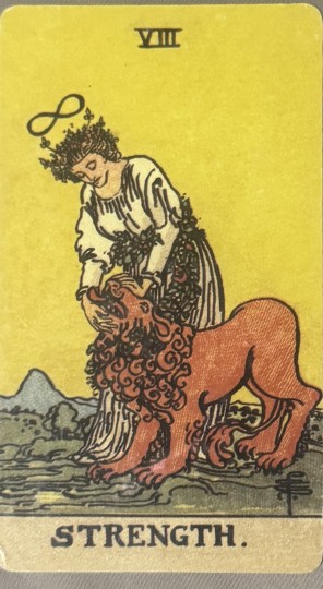 力量图案上有只狮子,在占星学上也与狮子座对应。狮子座拥有无上的勇气与领导力,在这里与女性特质结合,表现出来的不是壮汉的蛮力,而是内心的坚韧。试想,单人驯服一头狮子,用武力绝对是自讨苦吃,所以其必须运用她所拥有的特质,用柔性的力量来驯化狮子。要这么做,首先其必须拥有超人的勇气,否则其怎敢接近狮子呢?再来,其得拿出信心,深信自己会成功,这样的信心让其散发出自信的光芒,温和中自有一股威严让狮子降服。最后则是耐心,其必须慢慢来赢得狮子的信任,就像马戏团里的驯兽师一样,必得经过许多次的练习及失败,才能成功驯服猛兽。相同的道理也可以运用在克服内心的兽性与恐惧、愤怒与冲动,也就是克服我们内在的那头狮子。每个人都有本能的一面,也许当事人目前正面临心中欲望的交战,极力克服来自内心深处的那股冲动,力量牌则教导我们要接近它、倾听它、理解它并日驯服它。