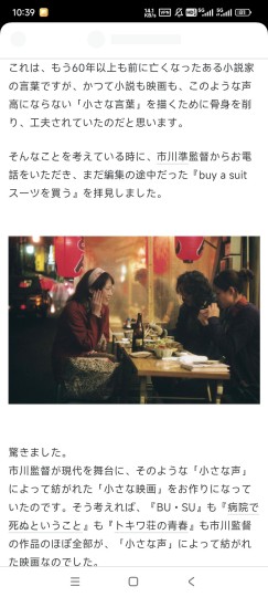铃木卓尔拍摄的起因是想通过拍猫来展现东京的变化,他发现自己以前很多喜欢的东京的店都慢慢消失不见了,于是将片场范围定在谷根千这一带下町,并集中往根津那块跑,谷根千多为丘陵地形,田村正毅背着个大块头摄像机跑上跑下,几次累到喊罢工。 拍东京自然离不开谈小津、成濑等人,还有熊切和嘉刚开拍的《海炭市叙景》,但他们开拍前聊得最多的,对铃木影响最大的是市川准,特别是《我不买西装》和《丑女》两部。当时恰逢市川准辞世不久,铃木拍摄的过程中还肩负着分发“市川准纪念放映会”传单的任务。铃木本人此前也和市川准合作过,崇尚那种都市中渺小却鲜活笃定的声音。怪不得我看这部电影时会觉得有点市川准的味道,原来和市川渊源颇深。