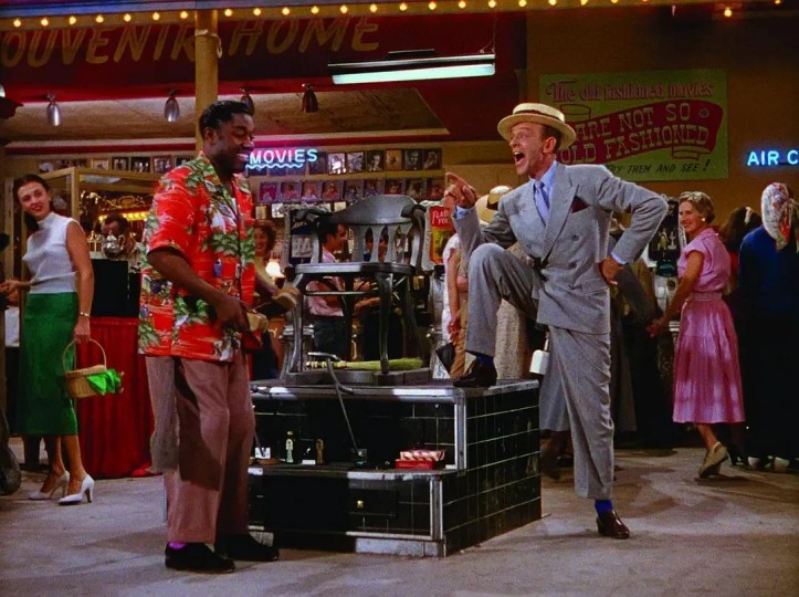 剧目发生的空间为Penny Arcade,意为备有娱乐机器与自动售卖机的便宜娱乐场。托尼在进入这一空间前便在百老汇的街上表达了对百老汇时过境迁的不满——第42街、新阿姆斯特丹剧场、艾庭剧场都已经变了样。整个剧目以托尼初入娱乐场的陌生感与疏离感,到从对自己颇为熟悉的娱乐机器中找到的旧式娱乐美学共鸣为序,随后进入“正戏”——与丹尼尔斯的双人歌舞。在舞段中,两人的空间关系多为立体的上与下:在前奏段,托尼站立俯视坐于擦鞋台下的擦鞋匠,并对其歌唱,歌词大意为“要从生活低谷中振作起来”,这同样也是对自己身处事业低谷期的激励,两人于此形成了上下的对立位置;在进入A段后,托尼用两个小节的时间站上擦鞋台高位,擦鞋匠则立侍其下,两人再次形成了上与下的对立位。这种空间处理是生活化的,表现了当时黑人的社会地位,这种生活化是爵士舞的特质之一,我们在歌舞片中能够看到各种随性起舞,例如一人在大街上突然跳起舞来,或者一名男子在追求一名女子的过程中,两人舞动以推动叙事,均是从生活状态中进入舞蹈的范例。在乐段进入主题,两人进入到了呼应式(Call and Response)的歌舞“对白”,托尼以歌唱、拍手或椅上舞步(Soft Shoe变奏)发起动机,擦鞋匠以擦鞋声响与舞步回应,我们不难发现,擦鞋匠的舞步均以流行舞蹈、舞厅舞蹈为素材,包含一些曳步舞、查尔斯顿舞、踢踏舞。在进入插部后,托尼从擦鞋台上越过擦鞋匠跳下,并将礼帽交予擦鞋匠保管,继而与围观群众及娱乐机装置互动,这时观看托尼、擦鞋匠舞蹈的路人与娱乐机的角色也发生了改变,不只是充当观众与舞美,也变成了舞者同托尼共“舞”,这种设计增强了整支剧目的娱乐性,也为我们进一步塑造了托尼——托尼对旧式娱乐的熟稔。终段回归双人舞母题,以礼帽归还/支付酬劳完成歌舞叙事的闭环。明奈利与基德藉此复现爵士时代“擦鞋歌舞”范式,并通过打破第四堵墙的集体交互,将空间转化为阿斯泰尔追溯早期娱乐美学的“乡愁”之地。
