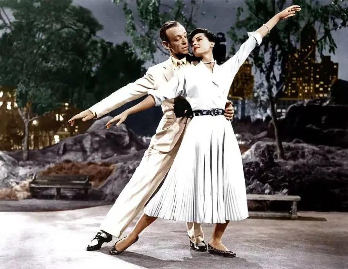 Dancing in the Dark是本片的另一支叙事性歌舞,标志着托尼与加布里埃尔从艺术对立走向和解与情感融合的转折点。阿斯泰尔与赛德·查里斯演绎的这支舞蹈在电影史中占据重要地位,其双人舞编舞范式对后世产生深远影响。场景设置于夜间空置的中央公园,仅以长椅、路灯及自然草木构成极简布景,舞者与舞美的实质互动仅依托一把石制长椅作为空间支点——作者正是通过这种极简的舞台设计,实现了舞蹈本质的纯粹性回归。