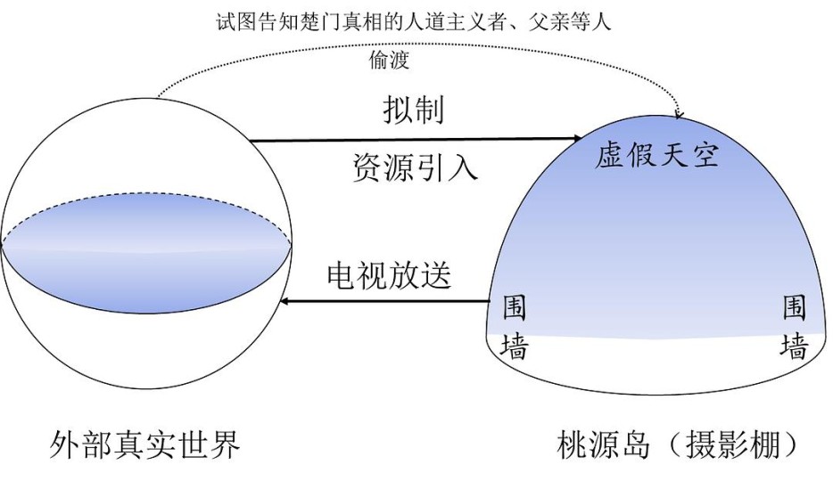 《楚门的世界》通过真人秀的譬喻再现了鲍德里亚拟像的四阶段论:当桃源岛这个巨大的“天圆地方”摄影棚建成后,意象对拟像的构造进入到了第三阶段,即“意象遮蔽真实的缺场”,此时现实和符号之间的差异完全消失,符号不仅仅代表现实,而是成为现实本身。楚门所处的“生活世界”(Lebenswelt)全部都是超真实的,周遭的物质实体全都是“按照模型产生出来的,从根本上颠覆了真实存在的根基”,但他自己却浑然不知被瓦解前的“真实”长什么样子。齐泽克对此归咎为“美国终极的偏执狂幻象”,当拟像全面覆盖真(the real)后,“加利福尼亚的晚期资本主义的消费主义天堂缺乏实体,被剥夺了物质惰性(material inertia)。”在真人秀开播之前,先得搭好布景,于是节目制作组拟制了一个完全拟像化的社会,人们的真实经验被符号体系所取代,生活在一个由媒体和符号构建的虚假现实。