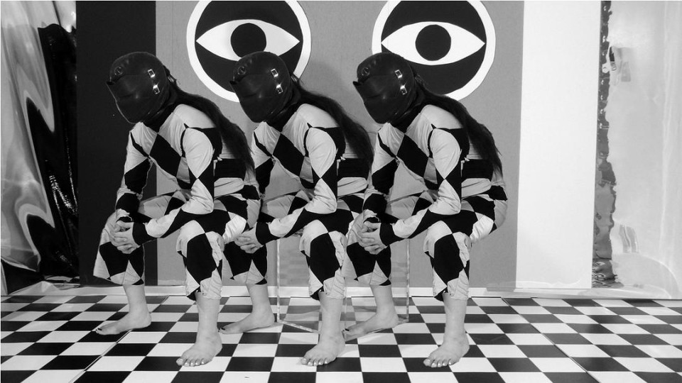 自我呈现的一种可能形式是类饰。有趣的是,在此个人层面上,我们不禁要思考所饰角色本身与扮演者本我之间的边界问题。这关乎身份认同的本质及其呈现自我的起点,同时也涉及艺术家同时存在与缺席所引发的矛盾感。村冈时而手持利剑亮相,时而身着黑白、明红或蓝衣,极具统一性的概念美学贯穿其作品。她直面疾病(Schizophrenia)带来的社会处境与私人困境,在众多矛盾角色中显现自我,以此表达切身的身份认同。部分自画像甚至完全省略了面部描绘。通过猫、窗户的意象,或以女儿与她共同活动的舞台布景,村冈传递的信息往往超越单纯的头像所能承载的内涵。对训练有素的观者而言,这些插入元素几乎成为她影片中的个人标记。在她的电影和诗歌中,村冈记录了主动强制与被动克制如何在她身处社会中心时的艺术创作中显现。但作为艺术家,她不仅感受到创作的强制性,更受制于必须带着愉悦感进行创作的道德压力。过去顺从是纪律与罪恶感塑造的个体行为准则要求,。而今个体面临的理想要求是通过主动性和精神力量实现自显。